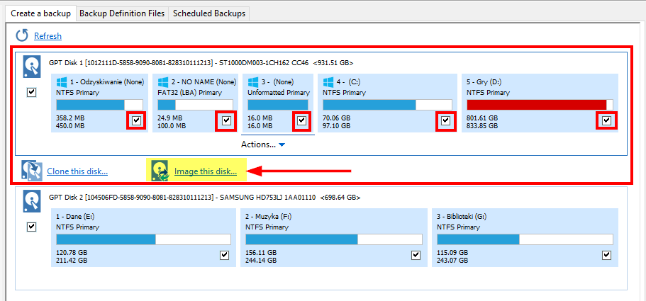 В моем случае это два диска — один с системой и играми, другой — с музыкой, фотографиями и фильмами. Чтобы создать резервную копию любого из них, сначала выберите его в списке. Затем выберите разделы, которые вы хотите включить в резервную копию. Если вы хотите создать копию всего диска, убедитесь, что выбраны все разделы, включая системные (восстановление, неназванный и т. Д.).