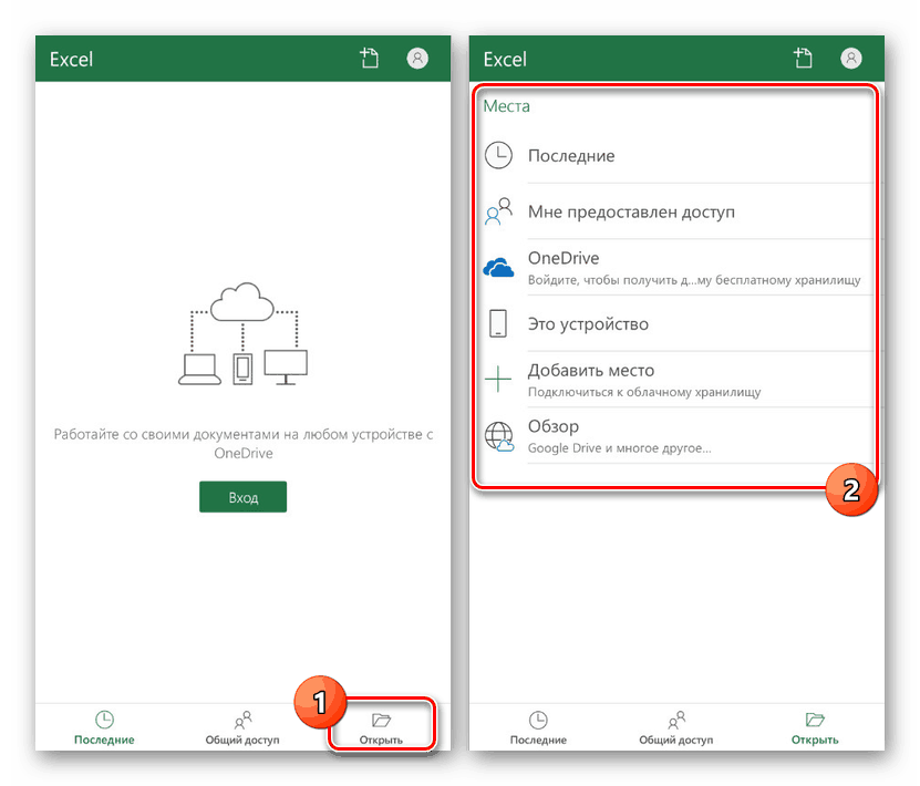 1. После установки и запуска приложения через меню в нижней части экрана перейдите на страницу «Открыть». Выберите один из вариантов месторасположения XLSX-файла, например, «Это устройство» или «Облачное хранилище».