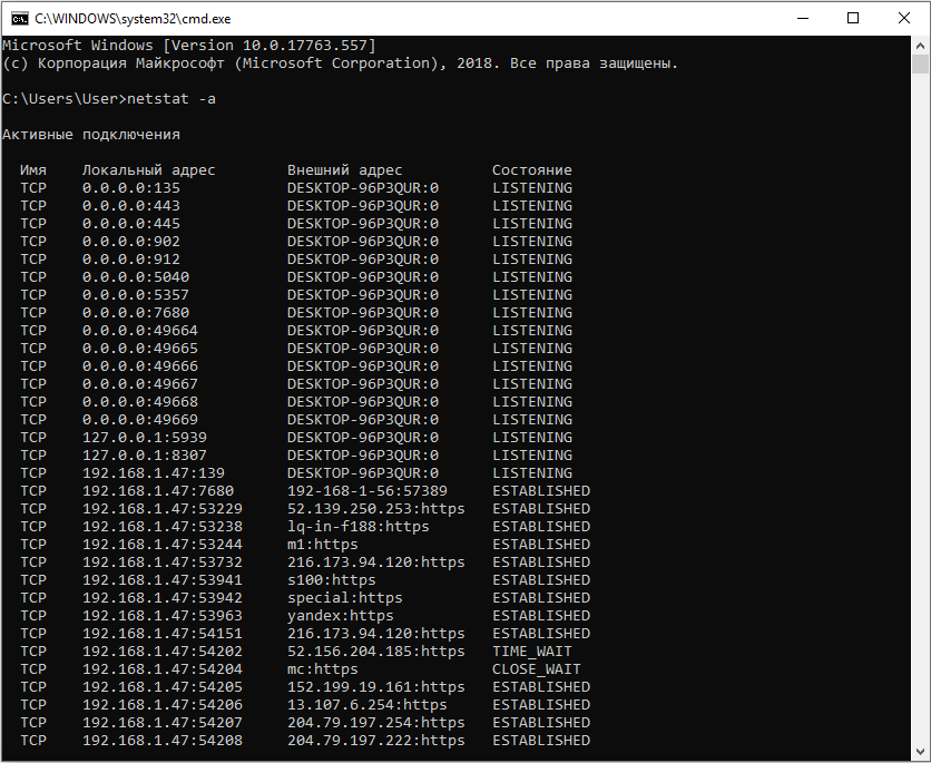 Посредством утилиты netstat перед нами отобразится список текущих установленных соединений или активных сессий. Каждая сессия показывает, по какому транспортному протоколу осуществляется передача данных. В локальном и внешнем адресах отображены данные об отправляющем и принимающем запросы хостах. Запись вида 192.168.1.47:53229 представляет собой в левой части сетевой адрес нашего компьютера, а в правой (после двоеточия) – присвоенный временный номер порта. Для установления кратковременной сессии между нашим компьютером и сервером (или какой-либо программой) порт выдается случайным образом, и может находиться в промежутке с 49152 до 65535. Все остальные порты вплоть до 49151 являются зарезервированными.