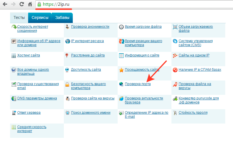 4. Заходим на любой сайт для проверки статуса портов (например, 2ip.ru) и выбираем вкладку «Проверка порта».