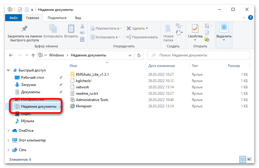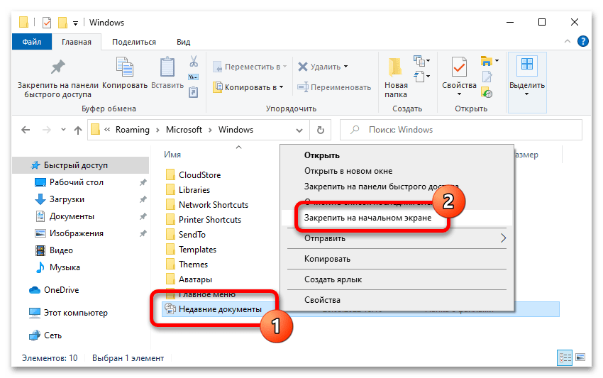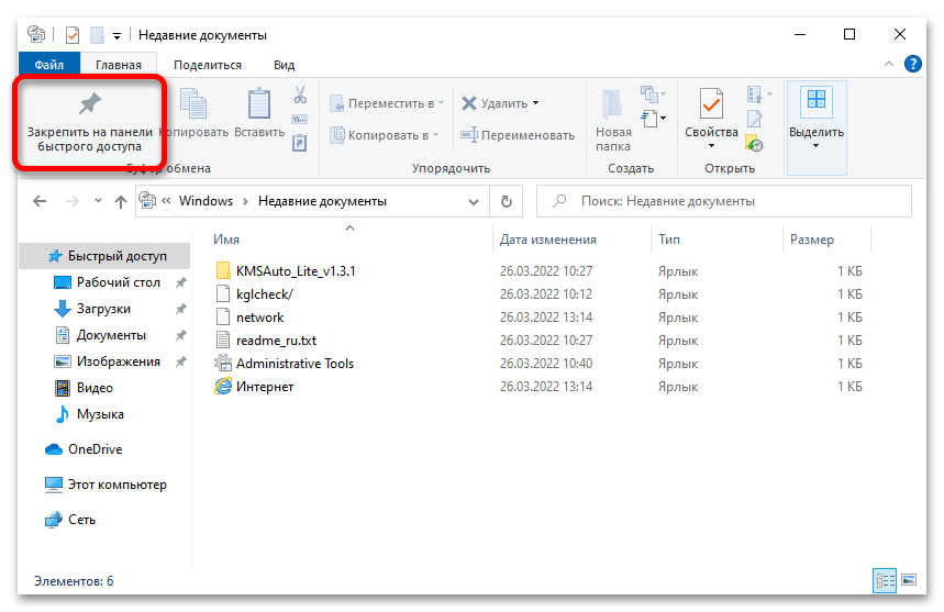 Объект «Недавние документы» является стандартной директорией, поэтому может быть добавлен на панель быстрого доступа, которая располагается в левой части интерфейса «Проводника». Для этого предварительно перейдите в папку с недавно открывавшимися файлами, раскройте вкладку «Главная» и кликните по пункту «Закрепить на панели быстрого доступа».