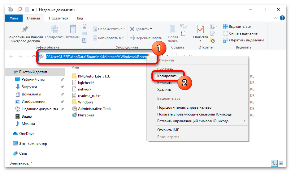 - Перейдите в директорию «Недавние документы», воспользовавшись одним из ранее описанных способов. После этого установите курсор в адресную строку, выделите весь путь к папке и скопируйте в буфер обмена через контекстное меню или посредством горячих клавиш Ctrl + C.