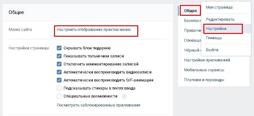 В правом верхнем углу нажмите на значок возле аватарки и выберите в в выпадающем списке «Настройки», после чего нажмите на кликабельную строку «Настроить отображение пунктов меню».