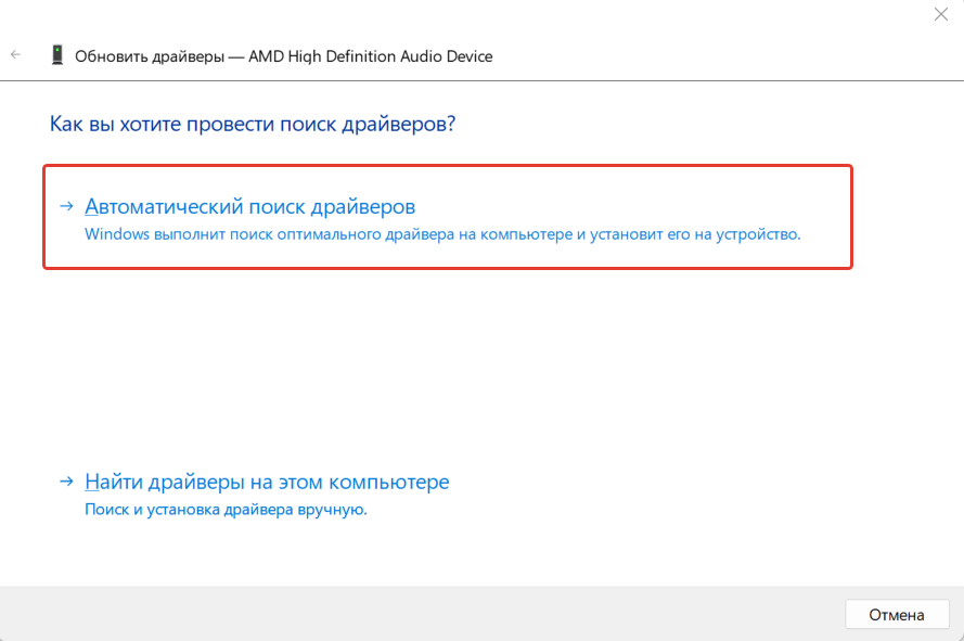 - Выберите вариант «Автоматический поиск драйверов», система произведет поиск актуальной версии прошивки и установит ее с вашего согласия (требуется подключение к интернету).