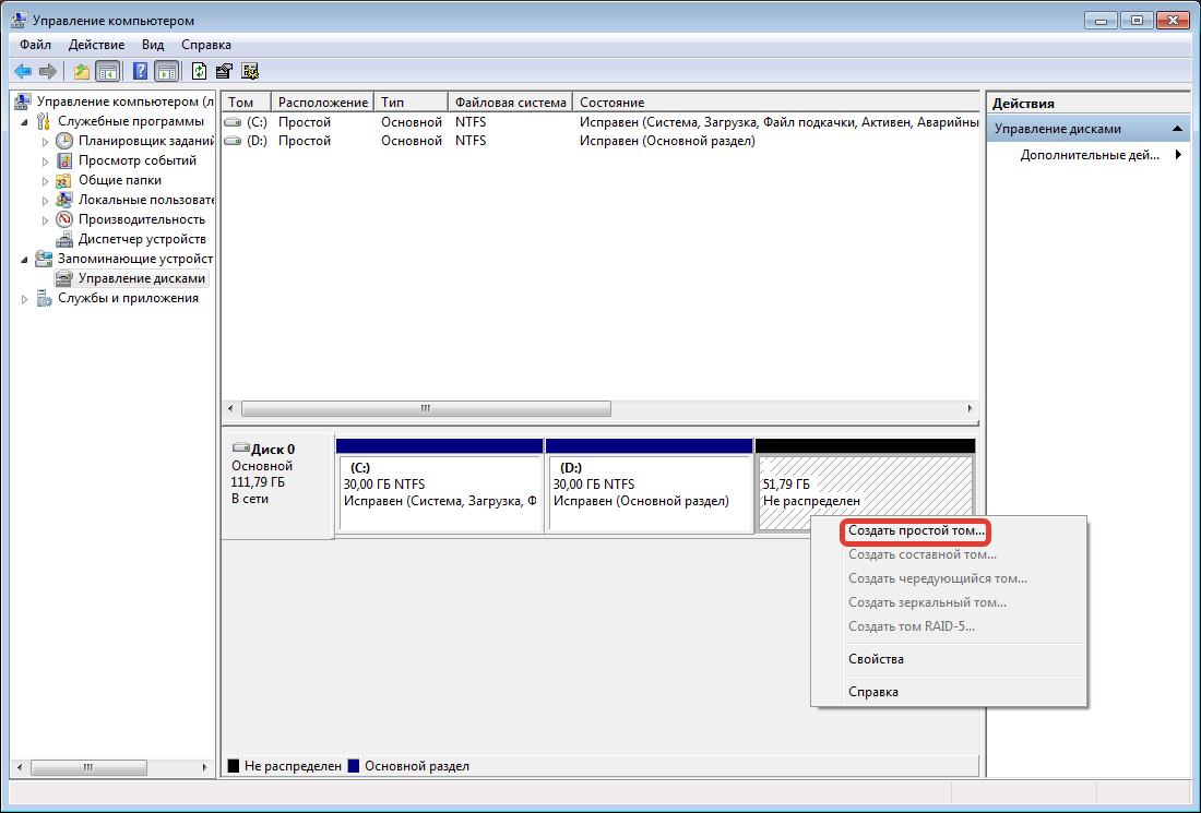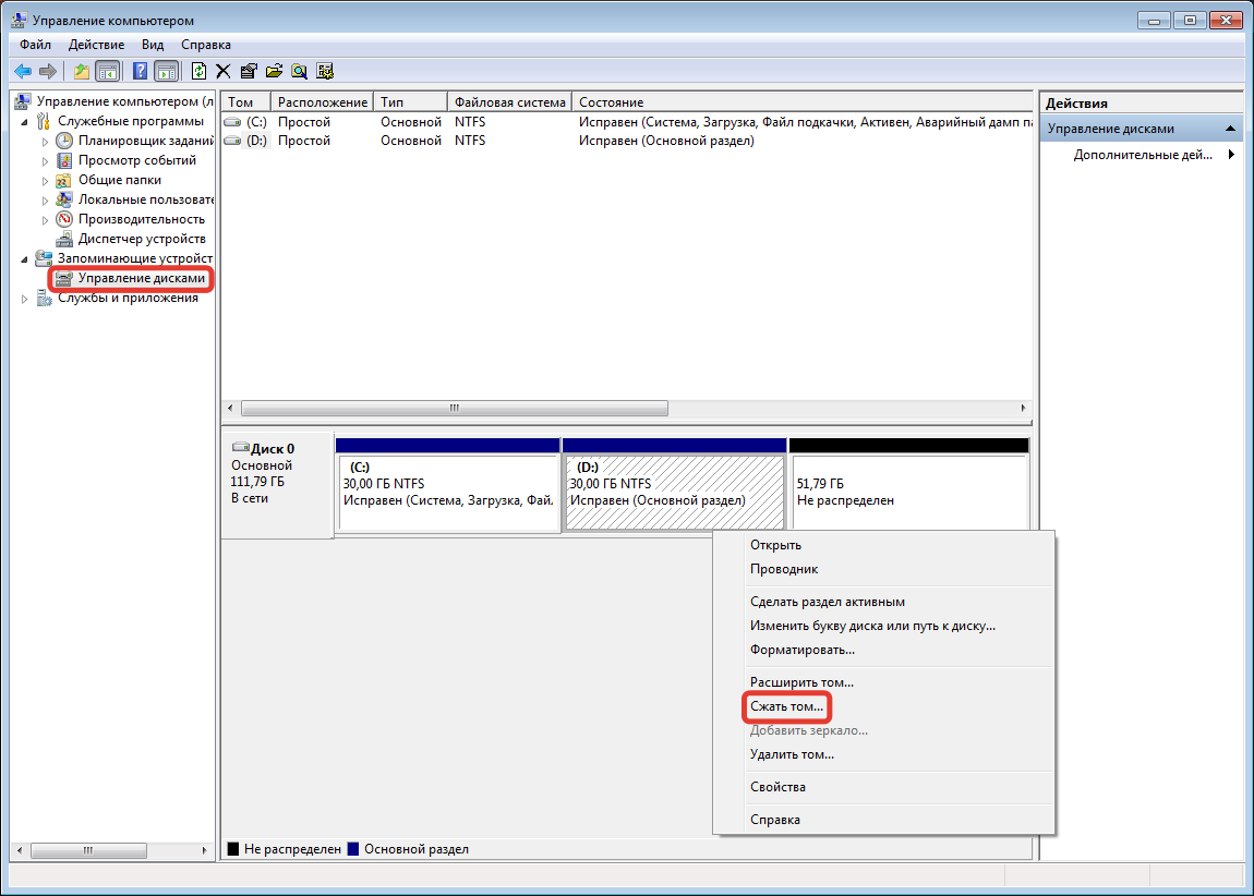 Потребуется сделать разметку дискового пространства, выделив часть места под файлы установщика ОС. Для этого нужно воспользоваться стандартной утилитой, предустановленной в Windows 7: