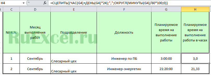 ЕСЛИ(ОКРУГЛ(МИНУТЫ(Q58)/60*100;0)>9;СЦЕПИТЬ(ЧАС(Q58);»,»;ОКРУГЛ(МИНУТЫ(Q58)/60*100;0));СЦЕПИТЬ(ЧАС(Q58);»,0″;ОКРУГЛ(МИНУТЫ(Q58)/60*100;0))) , где –