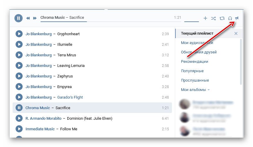 После нажатия появится достаточно большое выпадающее окно, в котором мы увидим список аудиозаписей из этого и других постов и уже привычный функционал плеера. Справа вверху можно заметить ранее описанный значок репоста — маленький рупор, на который нужно нажать один раз.