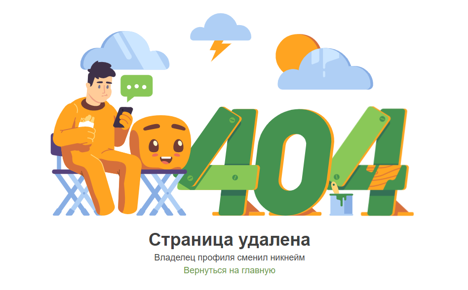 После переименования все ссылки с прежним ником ведут на страницу, отображающую ошибку 404. Это в первую очередь актуально для случаев, когда в старом никнейме были личные данные — например, телефон или имя.