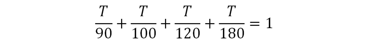 Время T — это общее время, которое потребовалось бы всем сотрудникам для совместного сканирования файлов. Скорость работы r в таблице является обратной величиной времени, которое потребовалось бы сотруднику, чтобы выполнить задачу самостоятельно. Сначала это может не иметь смысла, но думайте об этом так: поскольку Саша может выполнить одну задачу (сканирование всех файлов) самостоятельно за 90 дней, ее скорость работы составляет 1 задачу за 90 дней, что равносильно заявлению, которое она может выполнить. 1/90 задачи за один день.