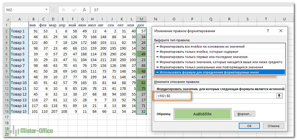 Обратите внимание, что здесь используются относительные ссылки, чтобы программа могла последовательно перебрать все ячейки указанной ей области, и при этом каждой ячейке из столбца М соответствовала ячейка из столбца В, расположенная в той же строке и относящаяся к тому же самому товару. Оформление выделенных ячеек настройте так же, как мы это рассматривали ранее