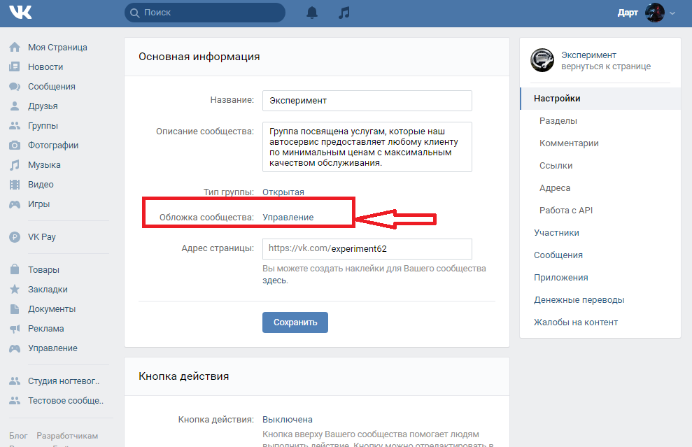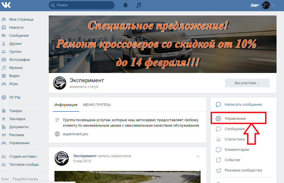 Войдя в сеть, переходим в группу и выбираем пункт «Управление», находящийся в меню, расположенном справа от контентной части.