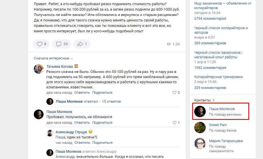 Так выглядит размещение контактов в сообществе