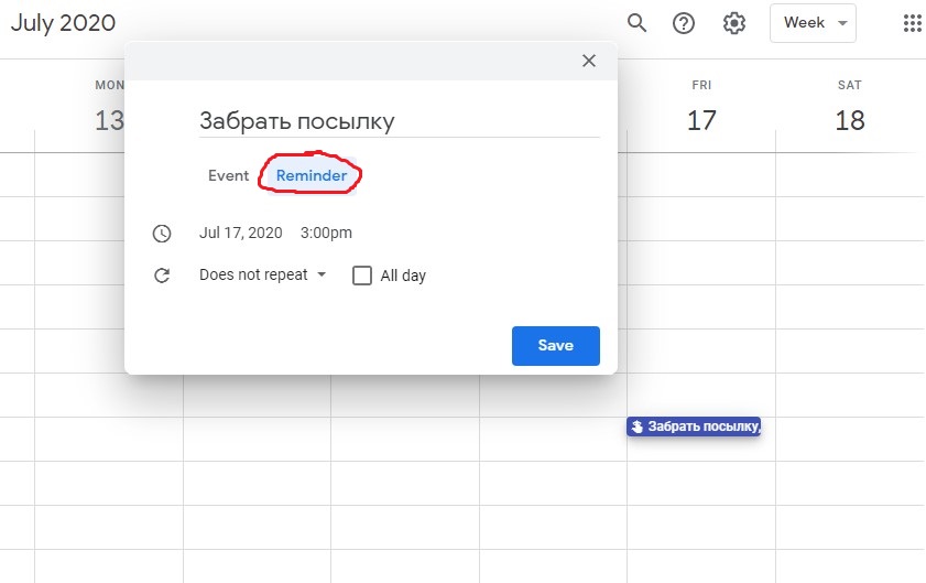 Установите напоминание о событии, чтобы быть уведомленным о предстоящей работе. Нажмите на поле «Напоминание» и выберите соответствующую опцию.
