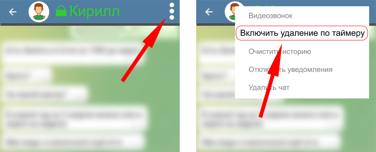 Настройка таймера для автоматического удаления истории сообщений. По умолчанию оно отключено. Для его активации просто откройте меню с настройками диалогового окна. Оно доступно по нажатию кнопки с тремя точками в правом верхнем углу экрана. Там есть пункт «Включить удаление по таймеру». В качестве вариантов доступны интервалы от одной секунды до целой недели.