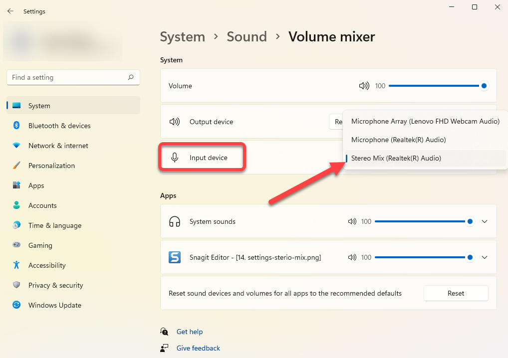 - Затем вернитесь на главный экран настроек и перейдите к Система > Звук > Микшер громкости. Выберите Устройство ввода как Stereo Mix из раскрывающегося списка.