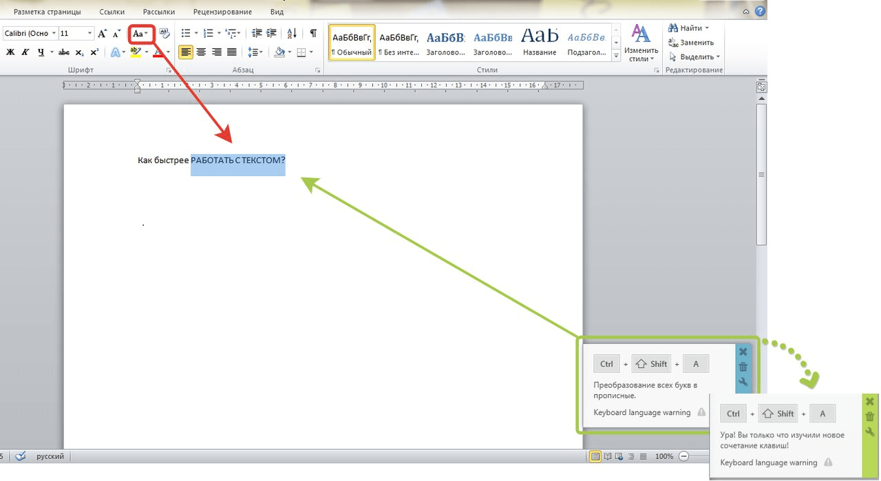 Часто бывает необходимым, чтобы фраза была набрана заглавными буквами. Проще всего это сделать, сразу набирая на верхнем регистре. Однако не всегда получается всё и всегда делать правильно, поэтому была разработана специальная команда по переводу выделенного фрагмента текста в верхний или нижний регистры — Shift+F3.