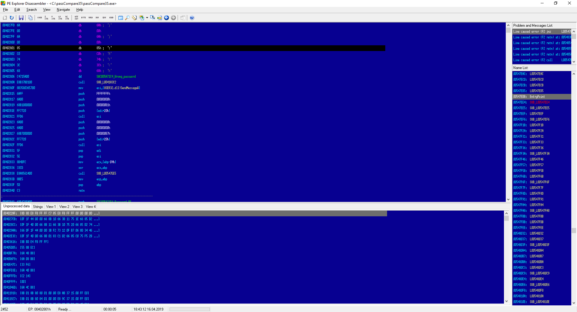 В открывшемся окне большую часть занимает область с дизассемблерным листингом, чуть ниже располагается шестнадцатеричный дамп. Если в заголовке нижней панели выбрать вкладку Strings, то отобразятся все строки в исследуемом приложении. Так что поиском можно найти и эталонный пароль. Однако для этого пришлось бы перебрать весь внушительный список доступных строк, так что отложим этот вариант до худших времен.