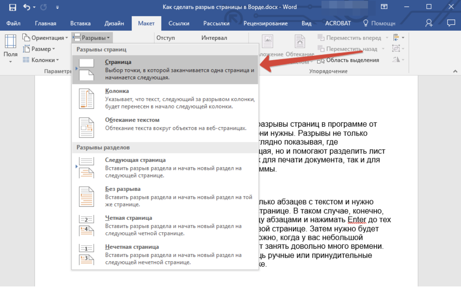 - Выберите, где вы хотите создать раздел страницы и разделите документ на две части.