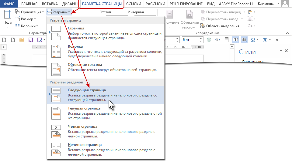 - Выберите вкладку « Макет », затем нажмите команду « Разрывы ».