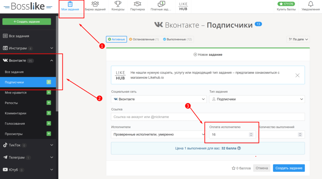Как только соберете нужное количество баллов, можете создать свое задание на накрутку подписчиков.