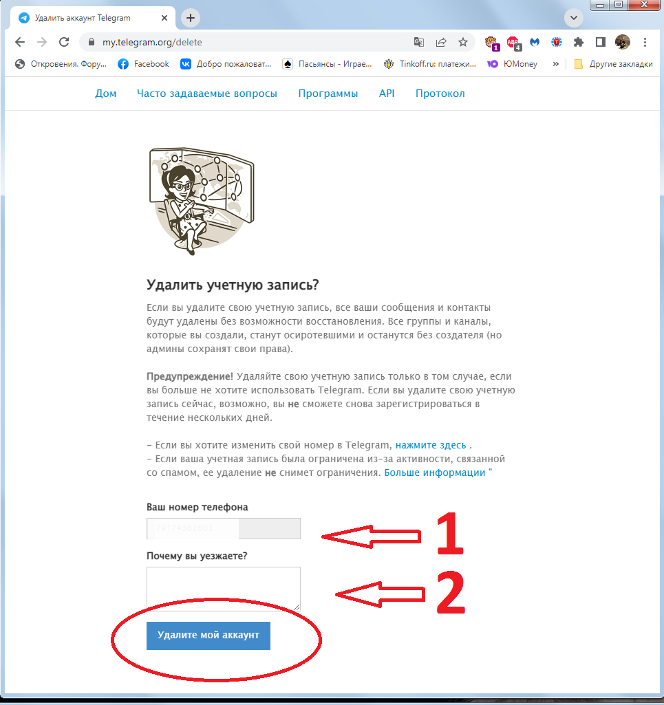 - Вводят комбинацию цифр и авторизуются на странице деактивации на сайте telegram.org: