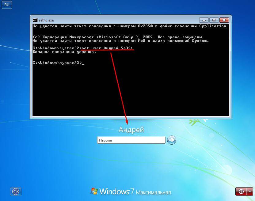 - Появится черное окно с копирайтом Microsoft и возможностью ввода текста. Необходимо набрать строку «net user {name} {password}“», где {name} — это имя учетной записи, а {password} — новый пароль.