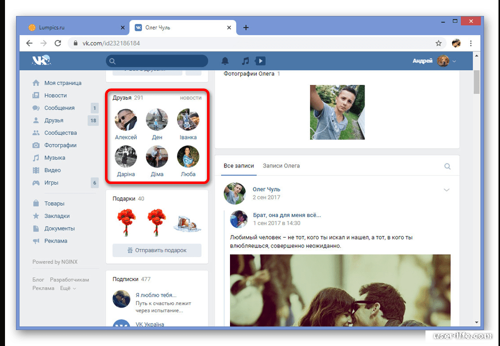 - Заходите на страницу интересующего вас человека и открываете его «дружеский» список.