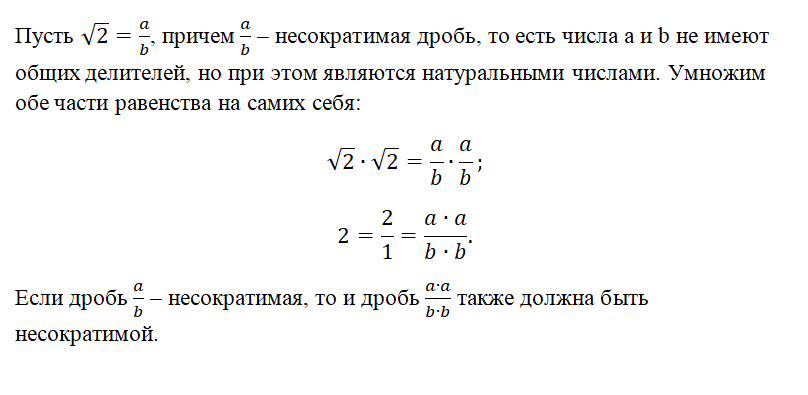При этом она равна дроби 2/1. Следовательно, b*b = 1 , а a*a = 2. Однако не существует такого натурального числа a, которое при умножении на себя дает 2. Получается противоречие, значит, нельзя представить в виде дроби. Математики говорят, что является иррациональным числом. Аналогичным образом можно доказать иррациональность квадратного корня из любого натурального числа, не являющимся квадратом другого натурального числа.