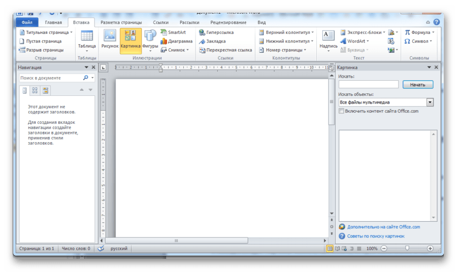 В создаваемый документ можно вставить рисунок из файла, сохраненного на компьютере, флешке, другом носителе. Нажмите на пиктограмму «Рисунок», чтобы открылось обычное диалоговое окно, в котором выбирается место нахождения файла и он сам. С помощью вкладки «Картинка» можно вставить клипы, которые имеются в MS Office.