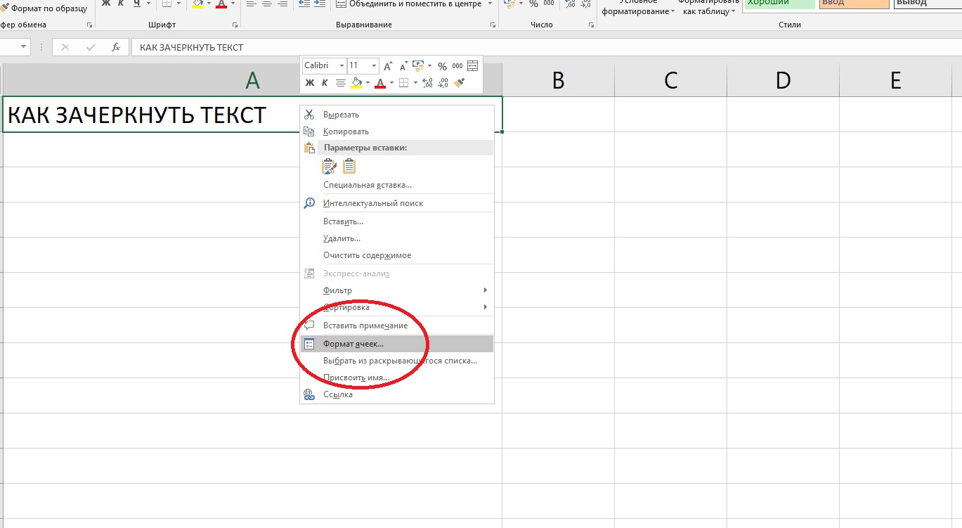 Это самый популярный метод зачеркивания текста. Он осуществляется при помощи окошка «Формат ячеек». Подробная инструкция: