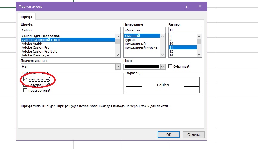 - Снова ставим галочку около «Зачеркнутый» и кликаем на кнопку «ОК».