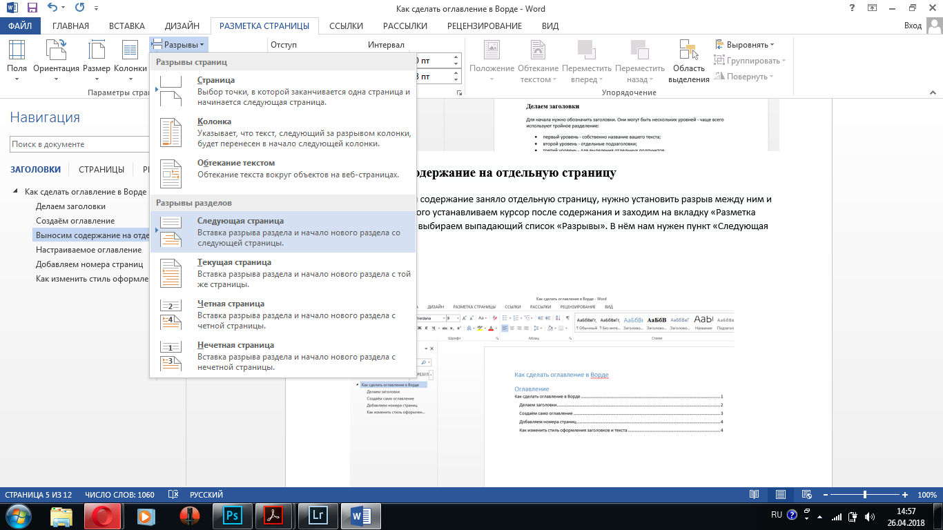 Вставляем разрыв, чтобы вынести содержание на отдельную страницу