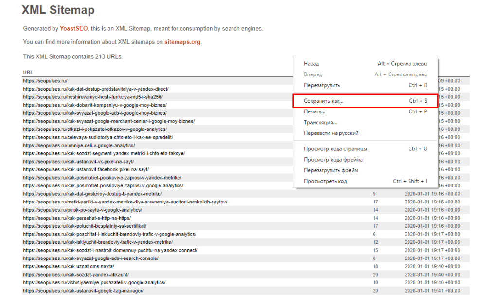 Получаем полный список из URL-адресов, который можно сохранить, кликнув правой кнопкой мыши и нажав на «Сохранить как» (в Google Chrome).
