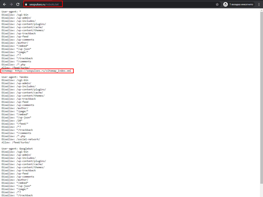 Однако, все эти методы работают на основе ссылок на страницы, если таблицы с URL-адресами нет, то можно ускорить этот сбор через карту сайта (Sitemap). Для этого добавляем к домену сайта конструкцию «/robots.txt». Например, «seopulses.ru/robots.txt».