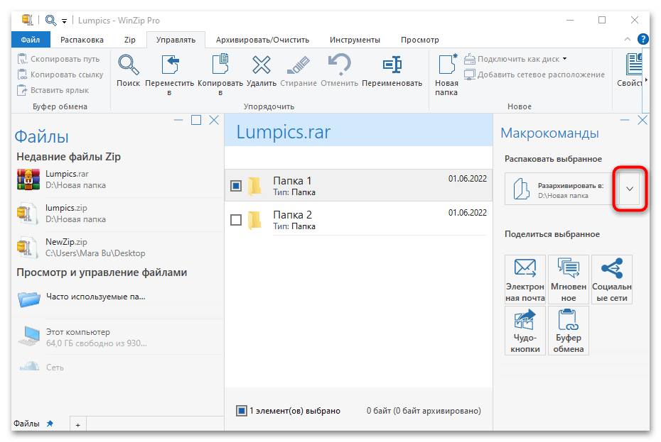 Чтобы выбрать другой путь, кликните по стрелочке рядом с кнопкой разархивирования.