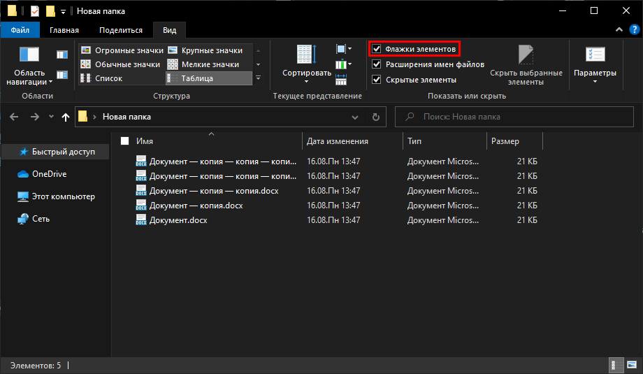 Эту функцию можно включить проще. Во вкладке «Вид» Проводника отметьте чекбокс «Флажки элементов»: