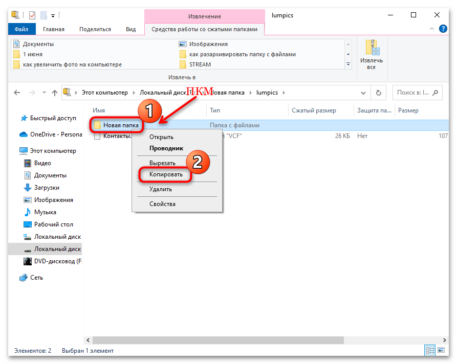 Запустится новое окно «Проводника», где отобразятся все файлы, которые были заархивированы. Чтобы извлечь папку оттуда, используйте функции «Копировать» и «Вставить» через контекстное меню или сочетание клавиш «Ctrl + C» и «Ctrl + V» соответственно.