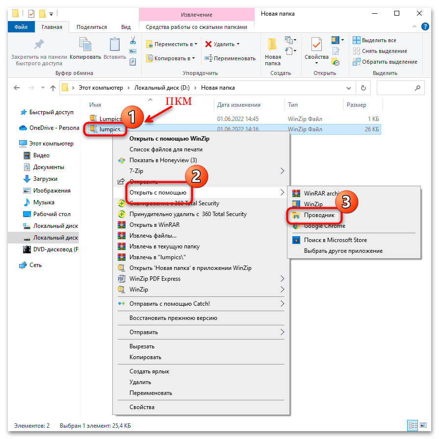 - Найдите ZIP-архив и щелкните по нему правой кнопкой мыши. В контекстном меню наведите курсор на пункт «Открыть с помощью» и из дополнительного меню выберите «Проводник».