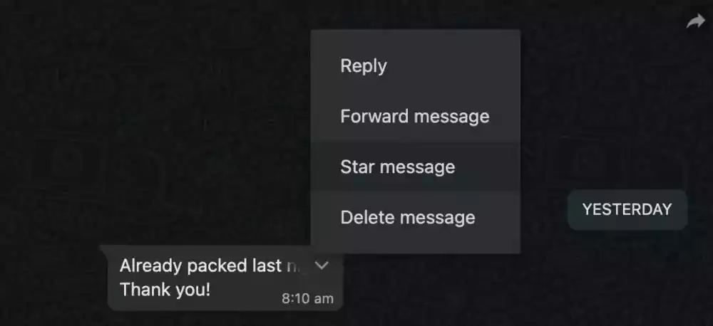 Существует также система закладок (своего рода), где вы можете сохранять важные сообщения для быстрого доступа позже. Просто выберите сообщение и пометьте его звездочкой. Затем вы можете перейти в отдельную область WhatsApp, чтобы просмотреть отмеченные вами сообщения.