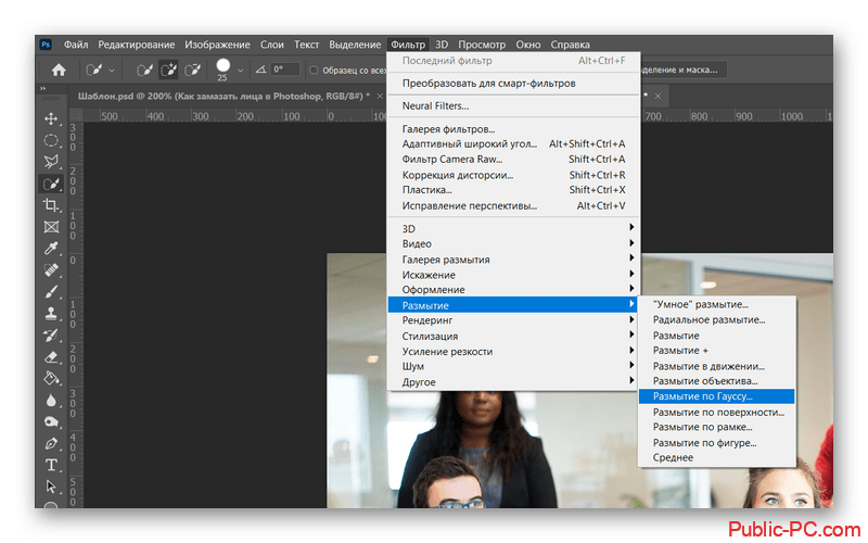 - В верхнем меню выберите пункт “Фильтр” и далее выберите категорию “Размытие”. Там уже кликните по “Размытие по Гауссу”.