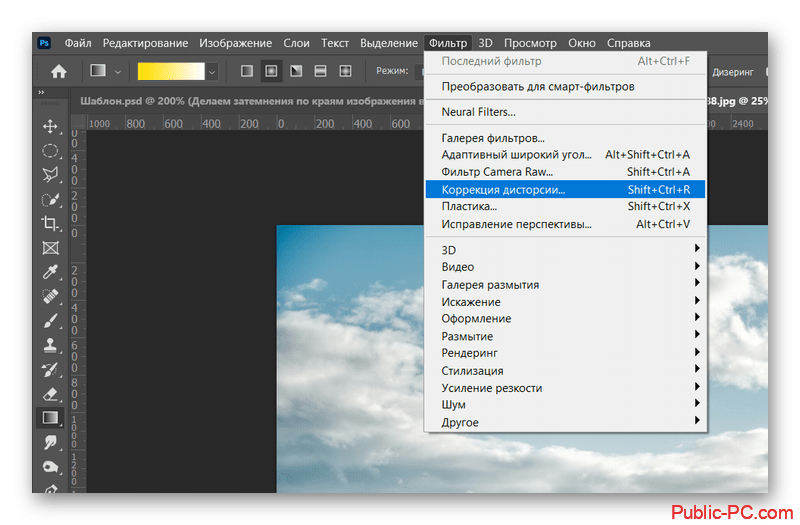 - В верхнем меню Photoshop кликните по пункту “Фильтр” и выберите в открывшемся контекстном меню вариант “Коррекция дисторсии”.
