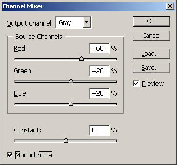 цветного изображения в ч/б является команда Image-Adjustments-Channel Mixer (Изображение- Коррекция-Микширование каналов).