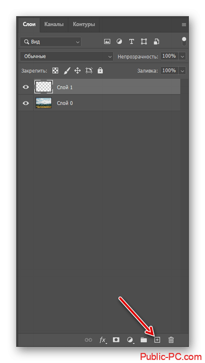 - Создайте новый слой поверх всех остальных. Для этого используйте сочетание клавиш Ctrl+N или нажмите по соответствующей кнопке в нижней части панели слоев. Этот слой будет использоваться для заливки.