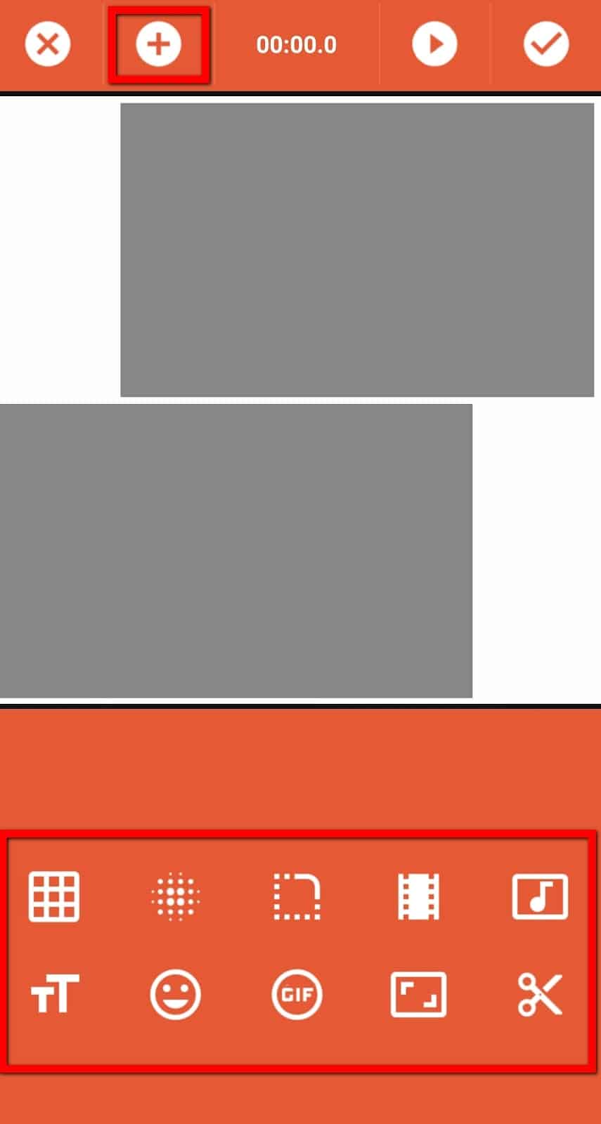 - запишите поочередно видео, нажимая на центральную кнопку или выберете из имеющихся видео из Галереи — синий плюс в левом нижнем углу,
