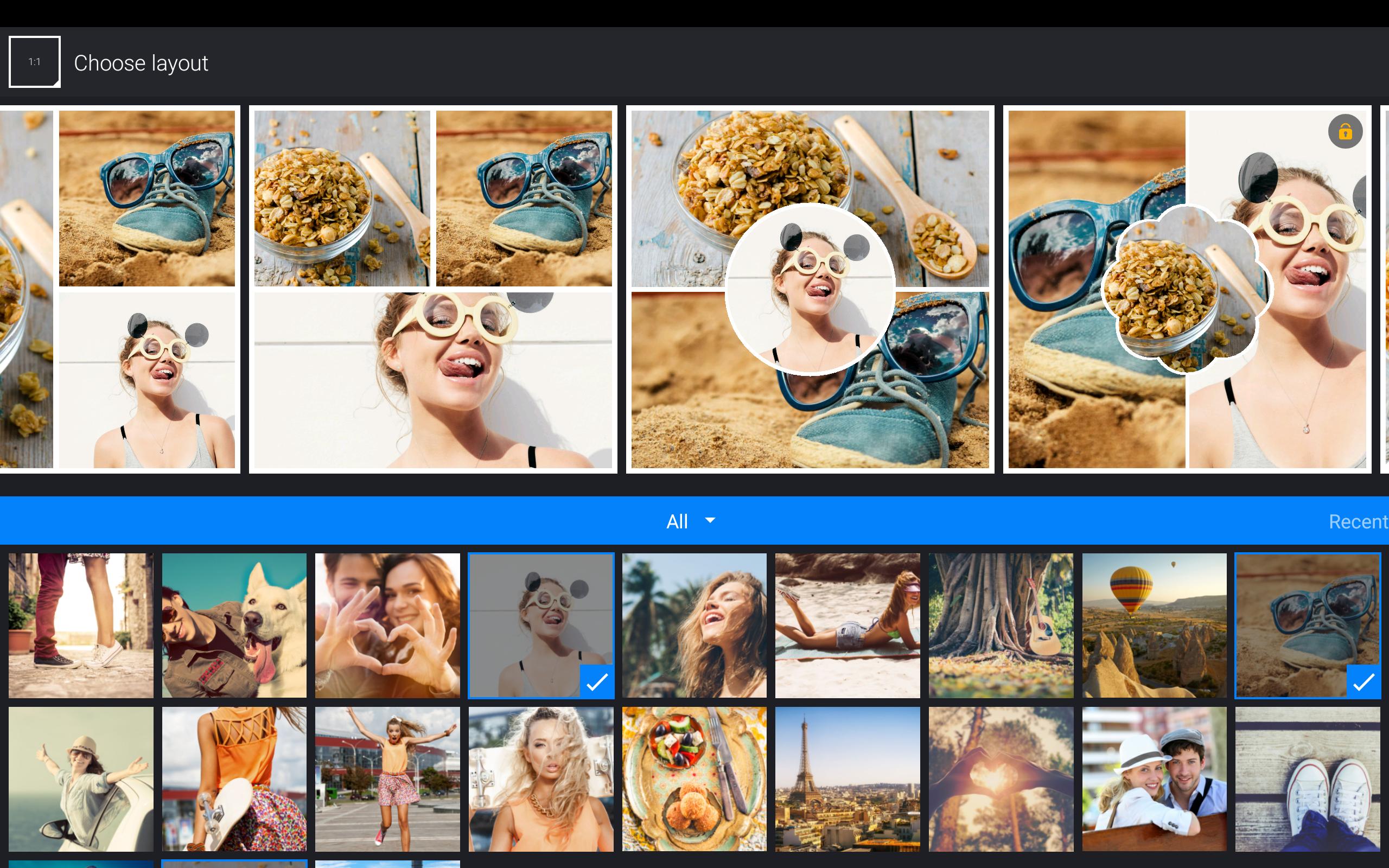 Работа в приложении займет чуть больше времени за счет расширенного функционала и настроек. Коллаж можно создать как на основе готового шаблона, так и с нуля. Приложение не ограничивает фантазию готовыми макетами: пользователь вправе сам решить, как будут размещаться фото или видео в коллаже.