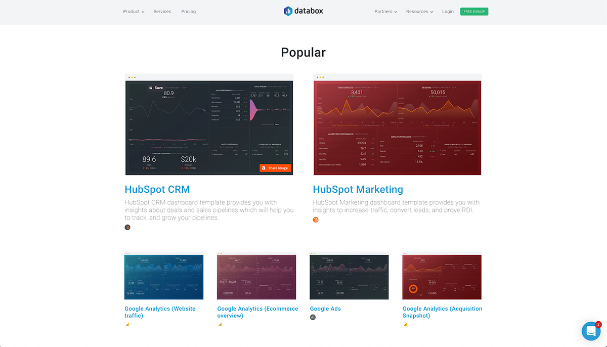 Шаблоны в DataBox ориентированы в основном на маркетологов, таких как HubSpot или Google Analytics. Это отличный инструмент для аналитиков бизнес-данных, которые хотят отслеживать усилия своей команды.