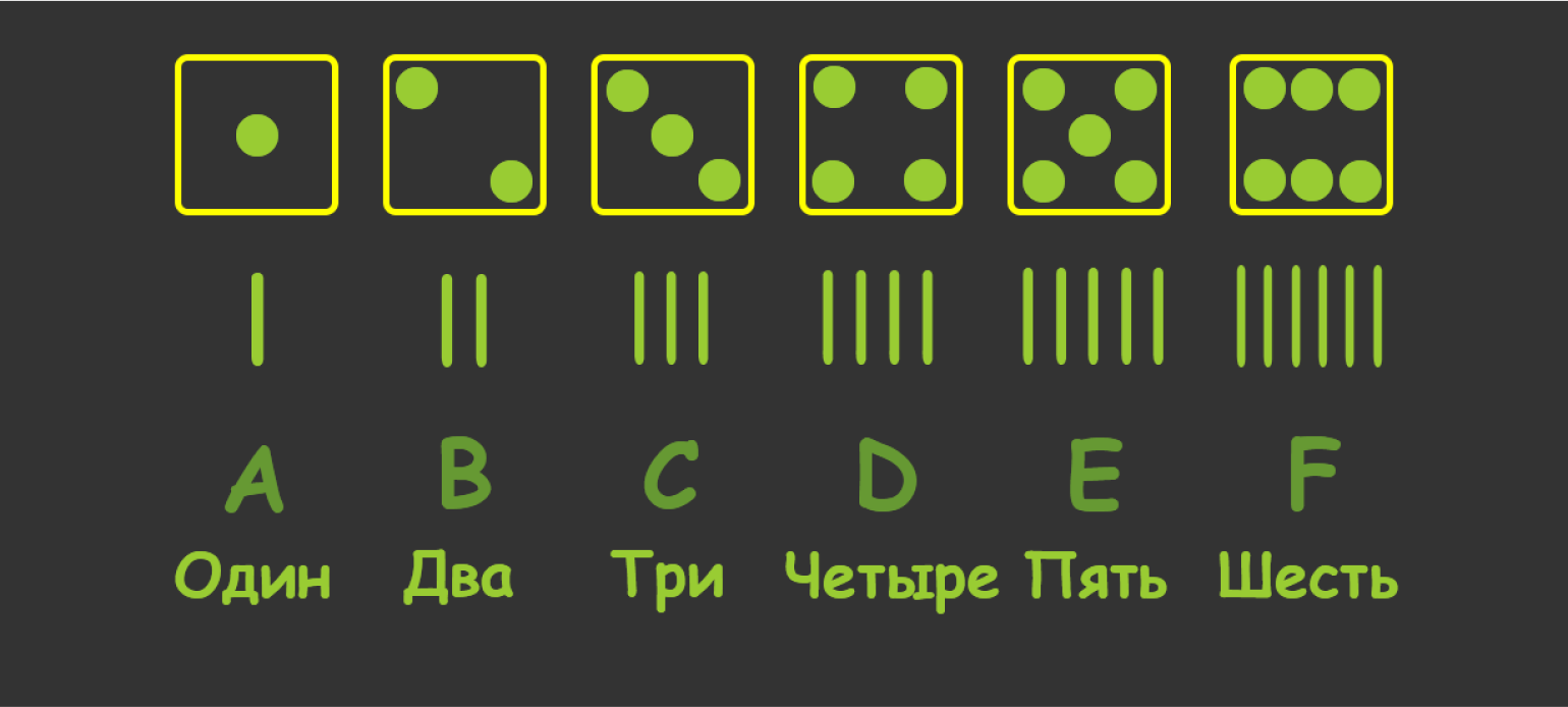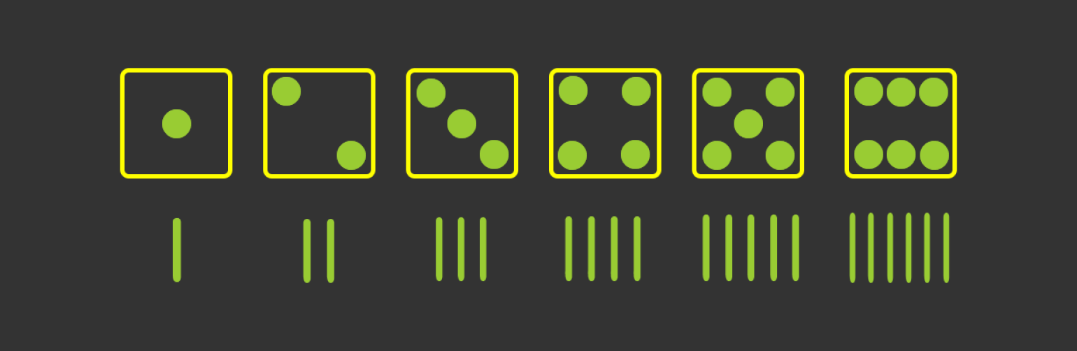 Возьмём игральные кости и попробуем описать их значения чёрточками: