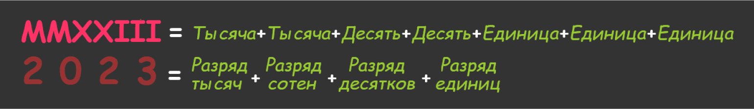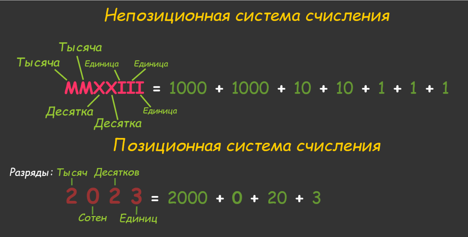 Эту проблему решили позиционные системы счисления, самая популярная из которых — арабская. Разница — налицо. Достаточно посмотреть на запись числа 2023: