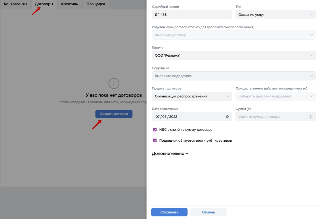 После этого создайте договоры. Договоры нужно загружать до старта рекламных кампаний. Можно загружать: