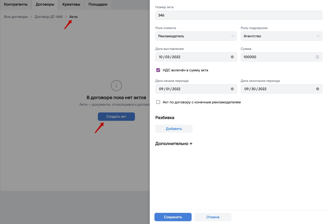 При загрузке акта можно провести его разаллокацию — разбивку общего рекламного бюджета на несколько сумм с пояснением, кому, какая, по какому договору и за какие работы была передана.
